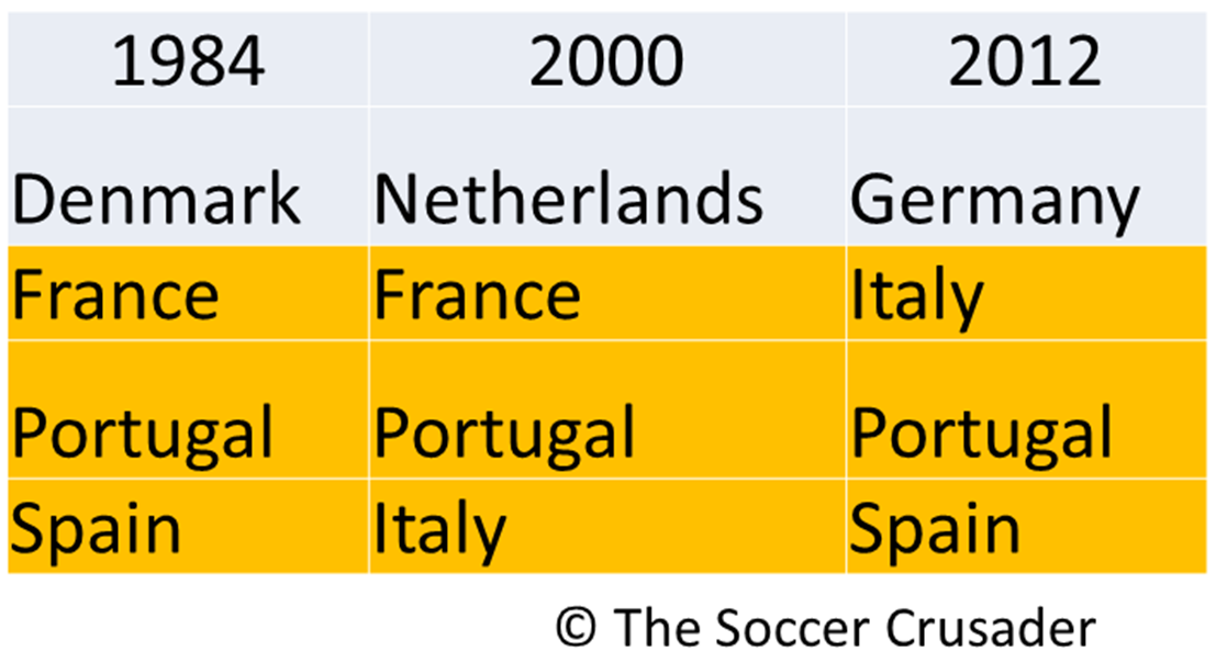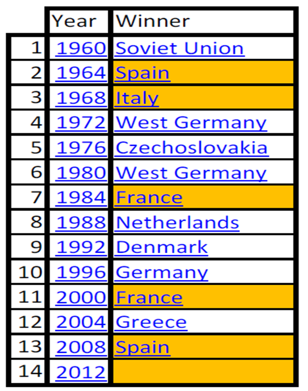 Only 20% (10 countries) of all the 50 countries in Europe are Latin. Tomorrow’s Final will be the sixth time when a Latin country (Romance speaking) will win the EURO, out of the 14 editions in total. All these 6 wins are split between three countries: Spain, France and Italy.